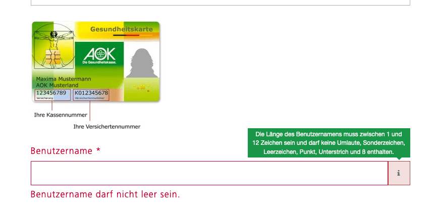 This is the online customer portal of the German health insurance company AOK. They have an extensive set of rules for both passwords and usernames. The password rules are: