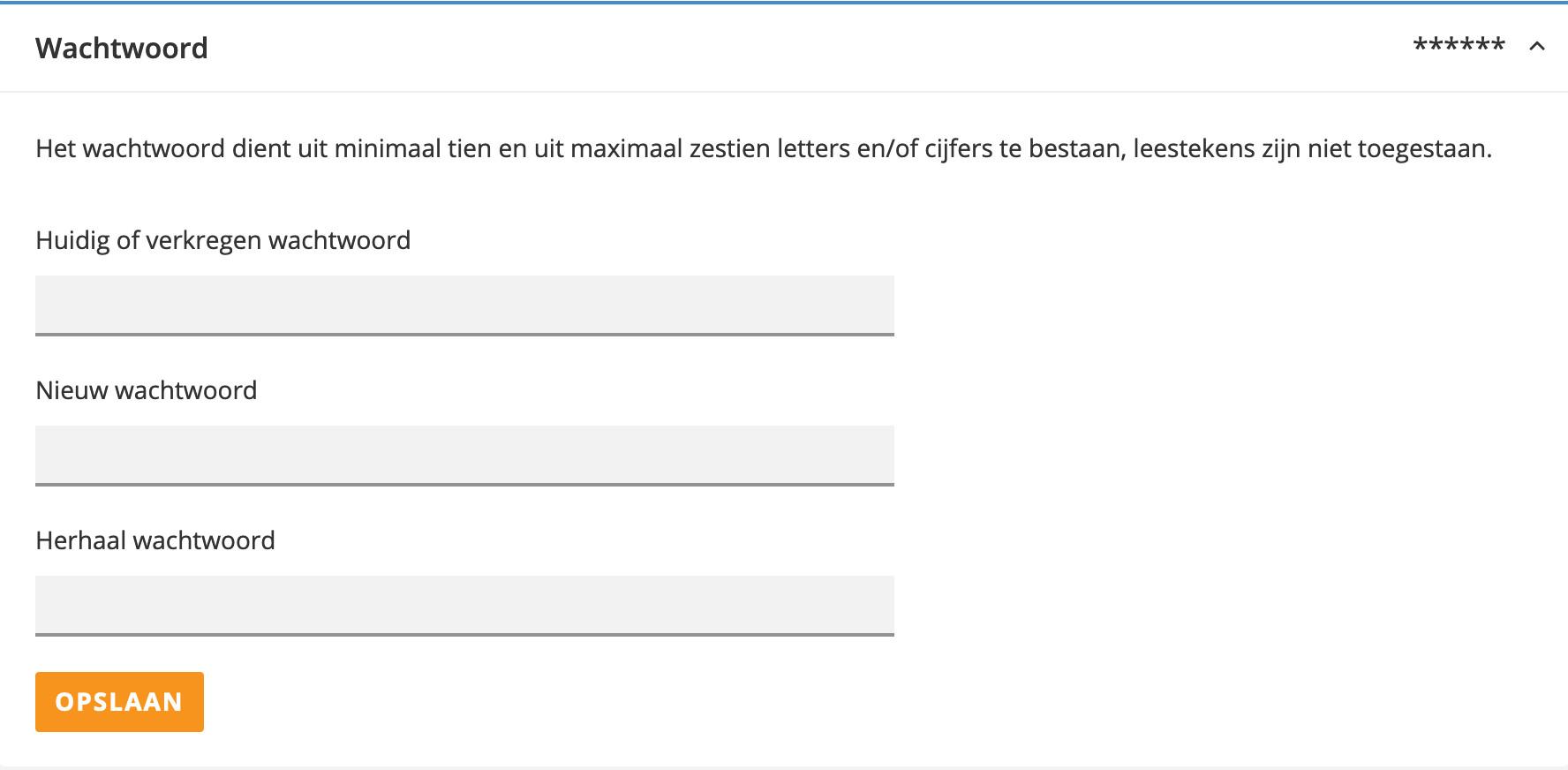 Between 10 and 16 letters and/or digits. No special characters are allowed. Must be renewed at least every 180 days, but you can configure to let the password expire sooner. When changing the password, the new password cannot be too similar to the existing password.