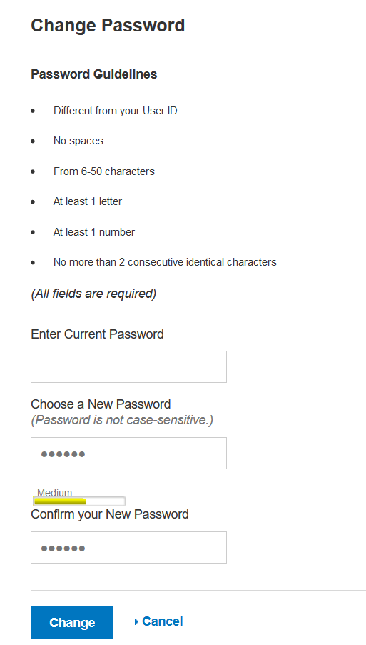 - Can't use ANY special characters (although, adding special characters increases the "password strength" meter?!)