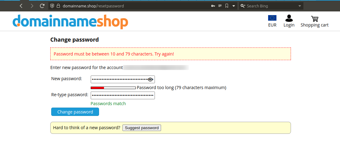Domainname.shop dumb password rule screenshot