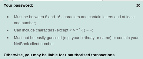 When resetting your NetBank password, the website only informs you that you can create an alphanumeric password, despite the fact that you can use special characters. And also, it's password strength calculation is shit. An 155 bits of entropy password is "weak." Additionally, passwords are case-insensitive. This isn't the worst I've seen, but on a bank, it's just bad.