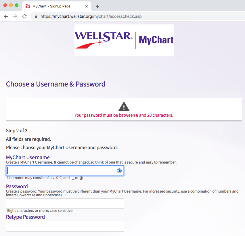WellStar MyChart dumb password rule screenshot